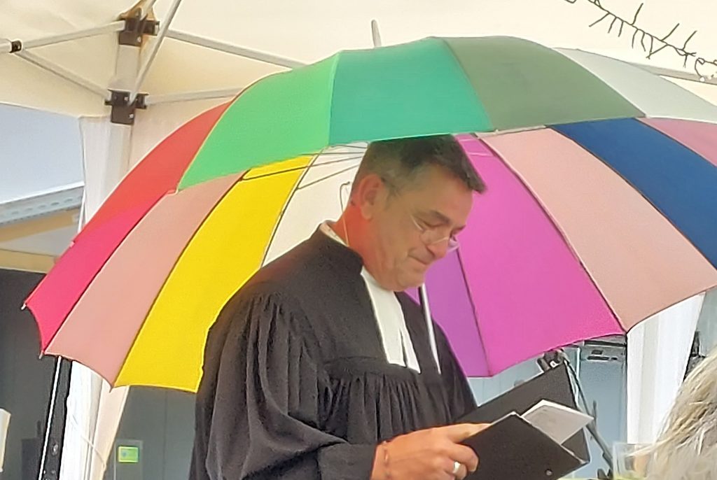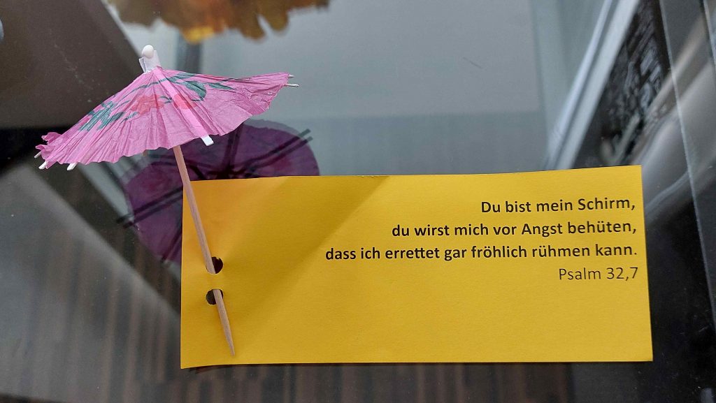 Mit einem Abschluss-Gottesdienst auf der Fepa-Cabana ging das Sommerfest 2023 zu Ende. Predigt, Lesung und Lieder standen unter dem Motto “Gut beschirmt durchs Leben gehen”. Zum Ende gab es für jeden ein eigenes Schutzschirmchen.