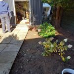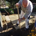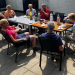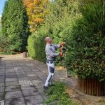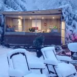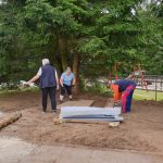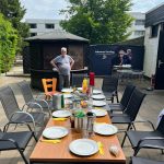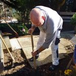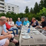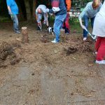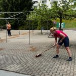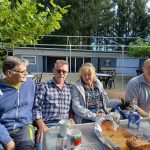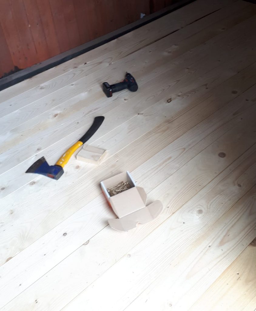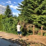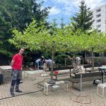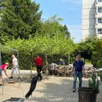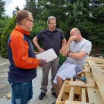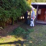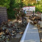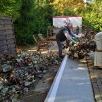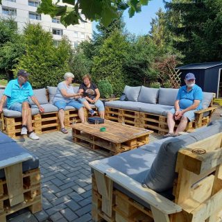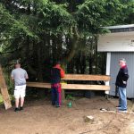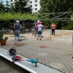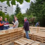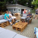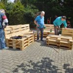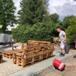 Fichtenhecke gefällt und auf einen Container gebracht, Palettenmöbel gebaut, Wandverkleidung wieder angebracht, war im Winter abgefallen. Auf die freie Stelle wird eine Hütte für Sitzkissen etc. aufgestellt. Zunächst muss ein Boden gebaut werden, das Team ist gerade dabei. Die Paletten werden noch etwas abgeflammt, die Kissen sind bestellt. Hier ein paar Bilder der heutigen Aktion: